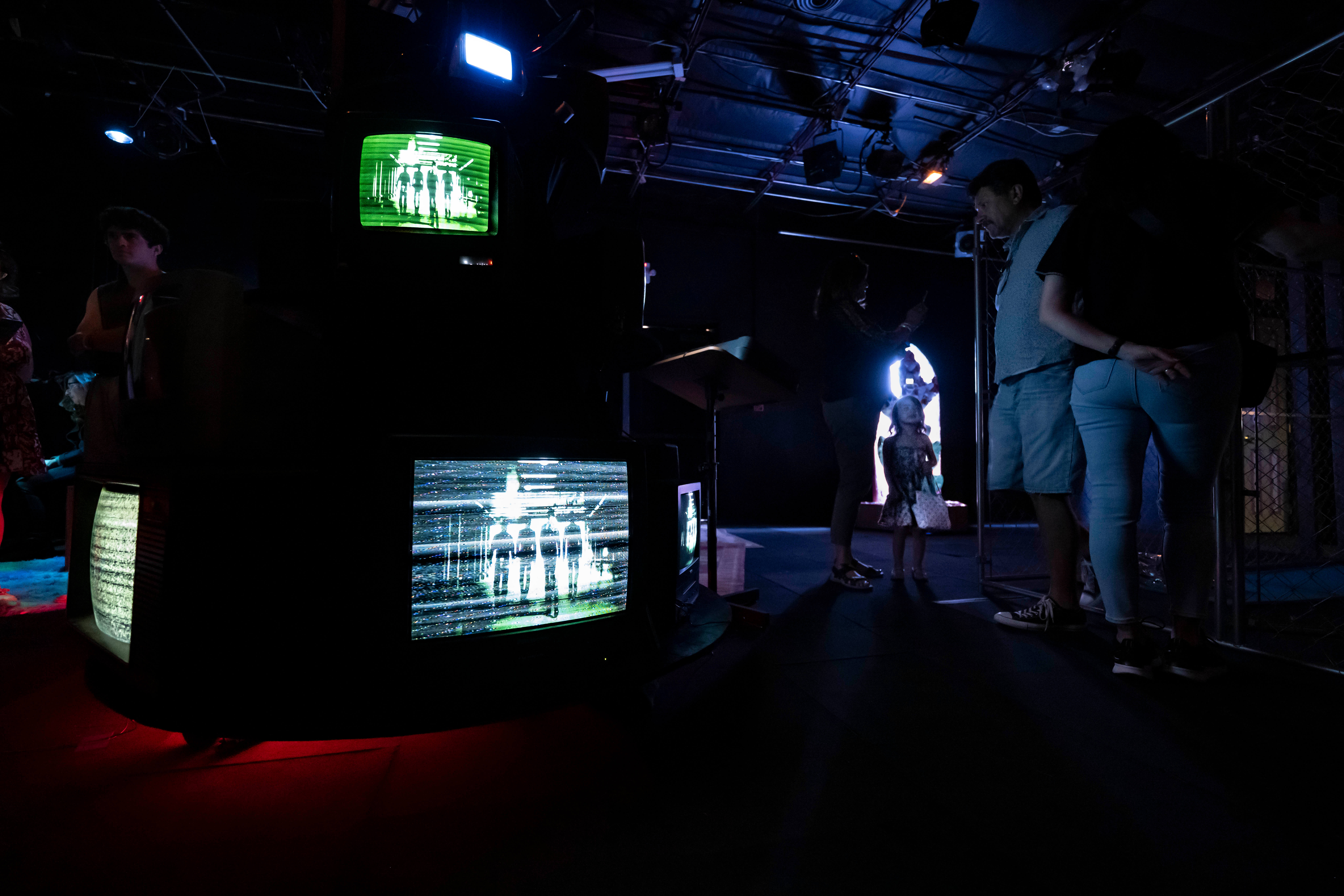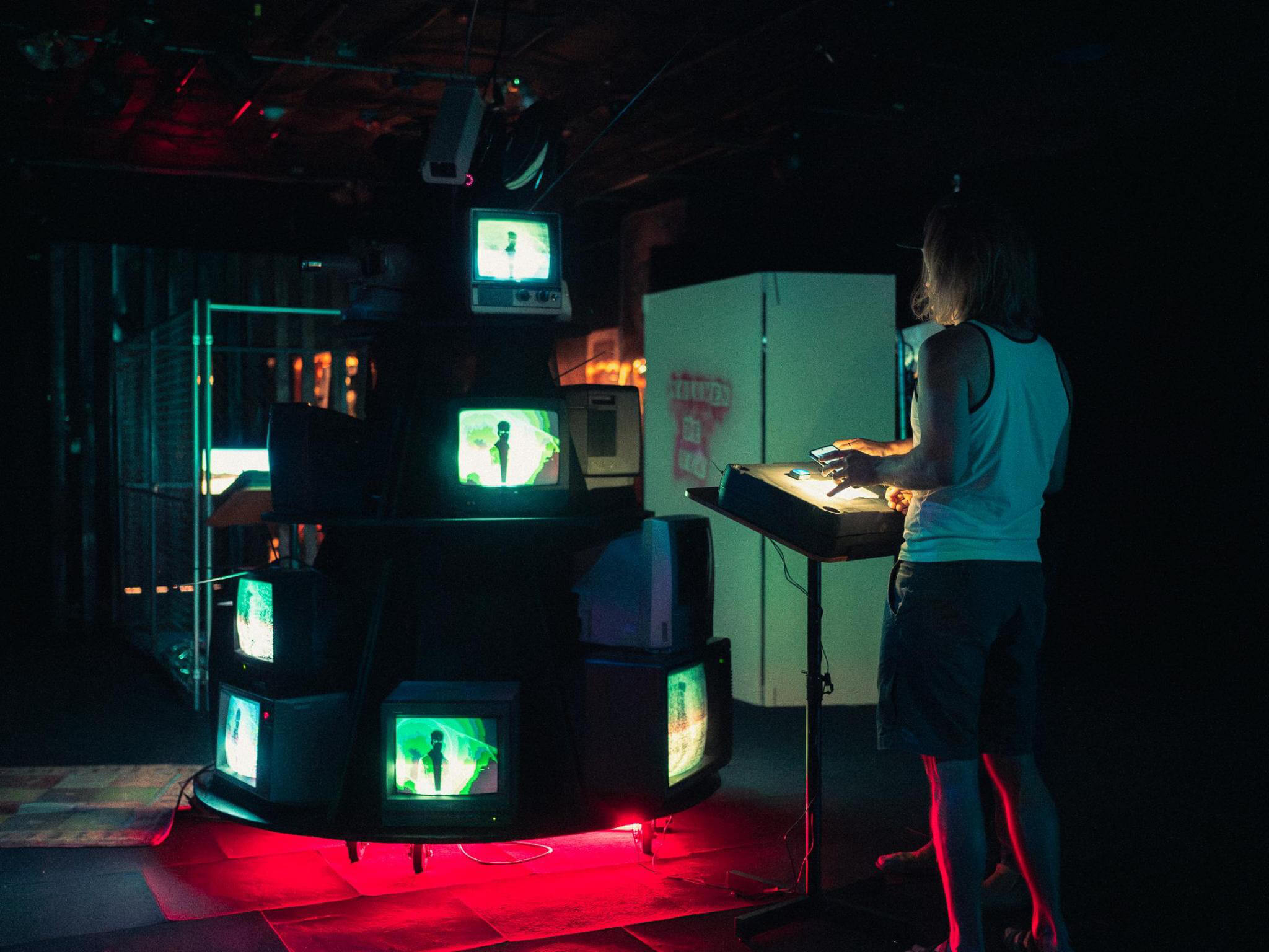 "Tower of Cower" is an indoor video and camera installation consisting of several vintage CRT and LED televisions, showing short silent films about surveillance. The tower also features gutted CRTs using mirrors as screen replacements, and televisions displaying live surveillance footage of visitors to the installation. All of the video inputs/outputs are controlled by a video matrix switcher box and a PC, using RCA and VHF/UHF transmission. Arduino-controlled buttons, sliders and sensors allow visitors to manipulate screens on the tower. The installation is visible from 360 degrees, with televisions positioned around the tower.